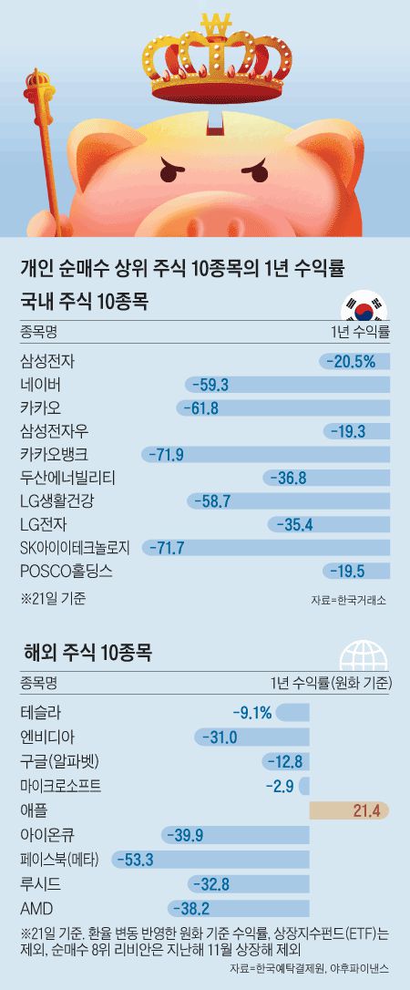 개인 투자자들이 많이 투자한 종목 중에는 최근 1년 사이 주가가 반 토막 난 종목도 많다. 대표적인 온라인 플랫폼 기업인 네이버(-59.3%)와 카카오(-61.8%)의 수익률이 저조했다. 카카오뱅크(-71.9%)와 SK아이이테크놀로지(-71.7%) 등 지난해 국내 증시에 데뷔한 종목들의 수익률도 전체 상장 주식 중 하위권이었다.