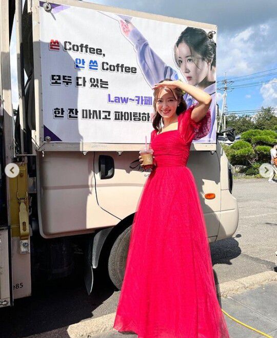 그러면서 이세영은 빨간 드레스를 착용한 채 촬영 현장과 커피차 인증샷을 남겨 웃음을 자아낸다.