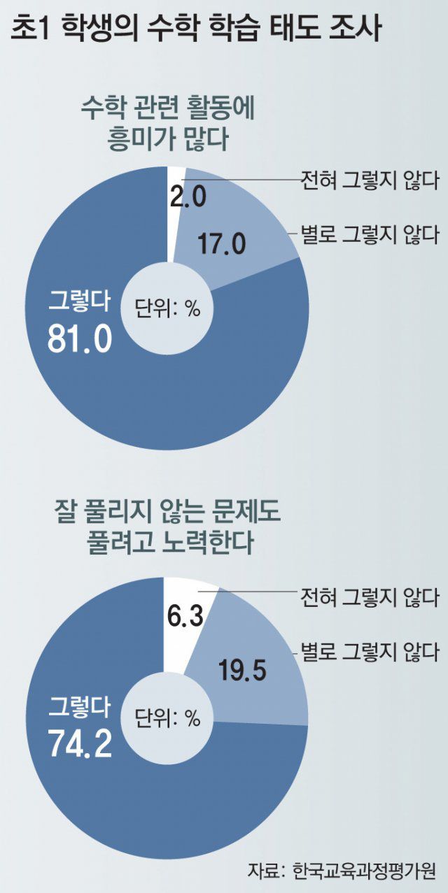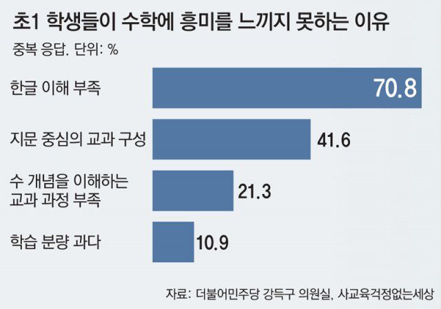 초등학교 1학년생 5명 중 1명은 수학에 흥미를 못 느끼고, 4명 중 1명은 문제 풀이를 지레 포기하는 것으로 나타났다. 어려운 수학 교과서가 ‘초1 수포자(수학포기자)’를 만든다는 지적이 나온다.