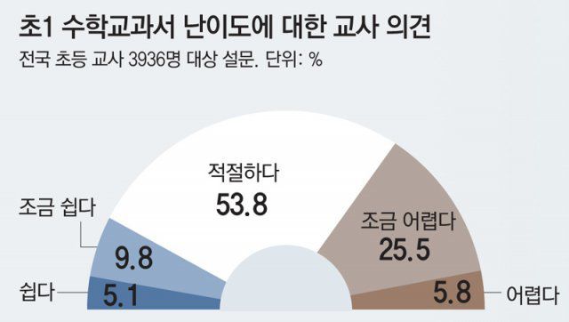 초등 교사들은 현행 초1 수학 교과서가 수를 처음 배우는 아이들에게 어렵다고 지적한다. 본보가 20∼25일 강득구 의원실, 사교육걱정없는세상과 함께 전국 초등 교사 3936명을 대상으로 진행한 설문조사에서 응답자의 31.3%가 “초1 교과서가 어렵다”고 답했다. ‘쉽다’는 14.9%, ‘적절하다’는 의견은 53.8%였다.