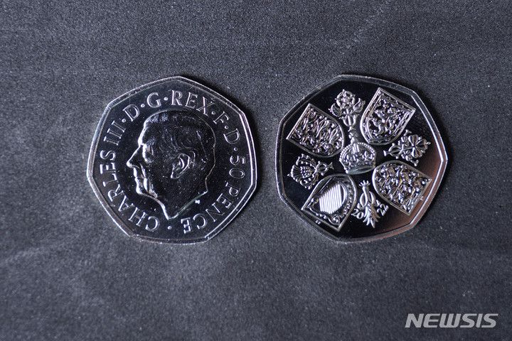 [폰티클룬=AP/뉴시스] 27일(현지시간 ) 영국 웨일스 폰티클룬의 왕립 조폐국에서 찰스 3세 국왕의 얼굴이 그려진 주화가 공개되고 있다. 찰스 3세 국왕의 즉위를 기념해 신규로 발행된 5파운드와 50펜스 동전은 12월 28일부터 유통된다. 2022.10.28.