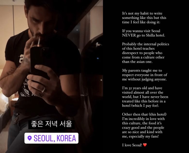 이어 "난 32살이고 세계 대부분의 나라를 다녀봤지만, 내가 돈을 내고 묵은 호텔에서 이런 대접을 받는 건 처음"이라면서도 "이 호텔을 제외하면 난 이곳의 문화와 음식, 내게 멋지고 친절하게 대해준 사람들에게 사랑에 빠졌다. 서울을 사랑한다"고 덧붙이며 오로지 호텔에 대해서만 불만이라고 밝혔다.