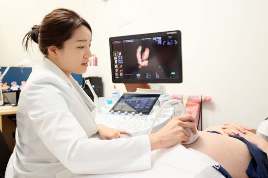 중앙대광명병원 산부인과 김유민 교수가 초음파검사를 통해 태아의 선천성 만곡족을 확인하고 있다.[사진제공=중앙대의료원] |