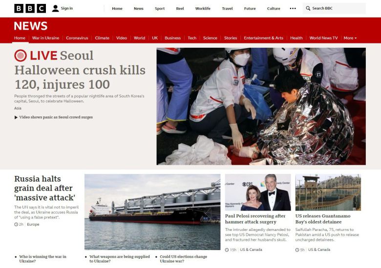 BBC는 이날 오후 뉴스 페이지 톱에 특집 라이브 페이지를 개설하고 서울 상황을 시시각각 전달했다. BBC는 “서울 핼러윈 압사 사고로 120명 이상 사망” 제목으로 “이태원 골목길에서 옴짝달싹할 수 없을 만큼 사람들이 몰리면서 군중이 패닉(공황 상태)에 빠졌고, 좁은 골목에서 사람들이 넘어지면서 사건이 터졌다”고 전했다. BBC는 수천여 명이 좁은 골목에 몰려 있는 소셜미디어 동영상도 전했다. BBC는 “(뒤늦게) 이 지역 휴대전화에 비상 알림 문자가 와 이태원에 모이지 말 것을 권했다”며 “유럽을 방문 중이던 오세훈 시장이 긴급히 서울을 향했다”고 전했다.