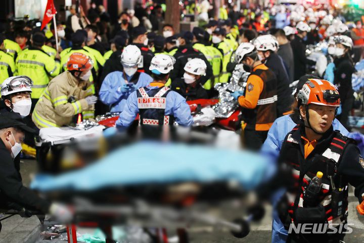 [서울=뉴시스] 김진아 기자 = 지난 29일 밤 서울 용산구 이태원 일대에서 대규모 압사사고가 발생해 30일 새벽 소방구급 대원들이 현장을 수습하고 있다. 30일 오전 4시 기준 이태원 핼러윈 압사 사고와 관련해 146명이 사망한 것으로 확인됐다. 부상자는 150명으로 사망자는 더 늘 것으로 보인다. 2022.10.30. bluesoda@newsis.com |
