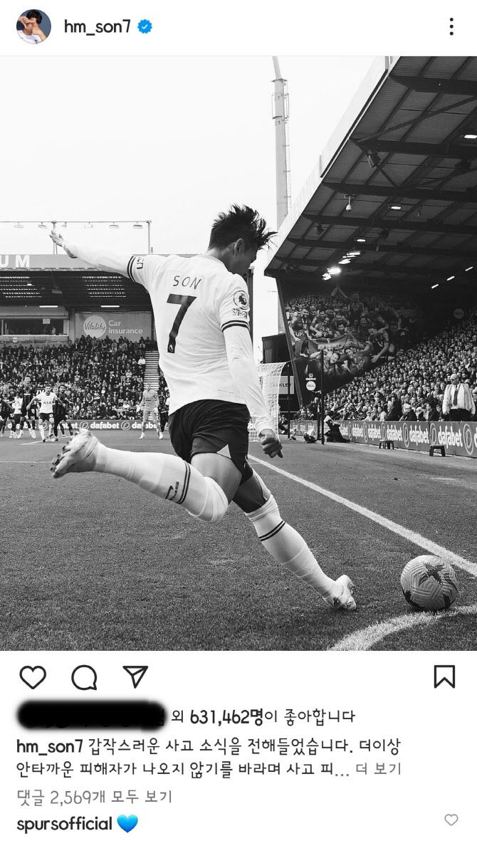 손흥민은 30일 자신의 소셜 미디어에 “갑작스러운 사고 소식을 전해 들었다. 더 이상 안타까운 피해자가 나오지 않기를 바라며 사고 피해자들께 깊은 애도를 표한다”고 글을 적었다.