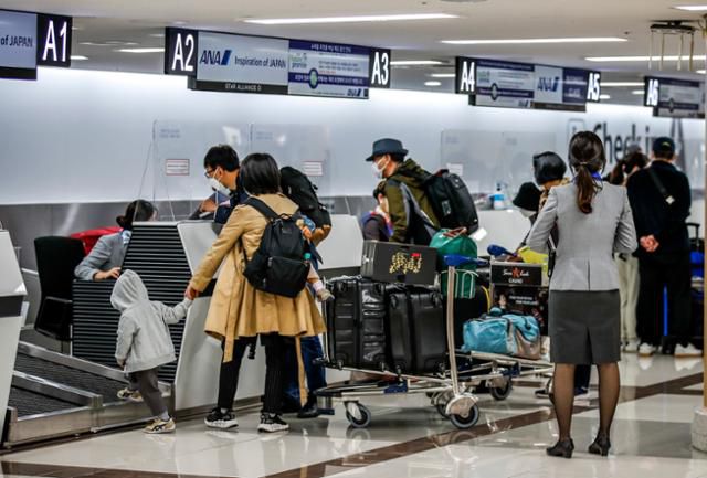 무비자 일본 관광이 실시된 이틀째인 12일 오전 서울 강서구 김포국제공항 국제선 출국장을 찾은 여행객들이 일본으로 향하는 항공기의 탑승수속을 밟고 있다. 뉴시스