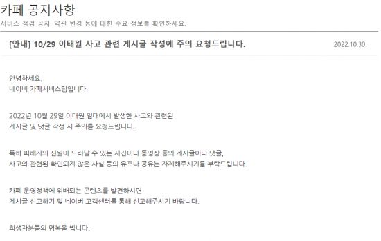 30일 네이버는 네이버 카페나 블로그 공지사항을 통해 "이태원 일대에서 발생한 사고와 관련된 게시글 및 댓글 작성 시 주의를 요청드린다"고 공지했다. 특히 피해자의 신원이 드러날 수 있는 사진이나 동영상 등의 게시글, 댓글, 사고와 관련해 확인되지 않은 사실 등의 유포나 공유는 자제해 달라고 당부했다.