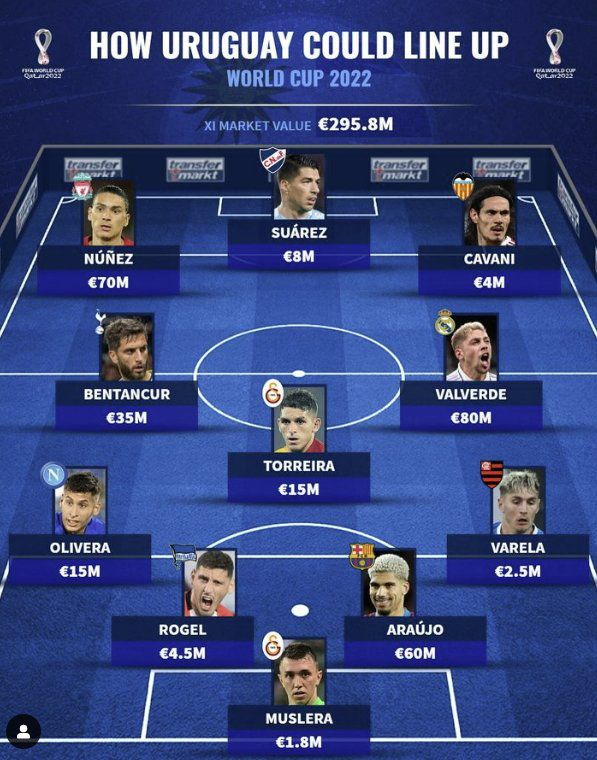 벤투호의 월드컵 첫 상대인 우루과이 베스트11의 이적시장 가치. 사진 트랜스퍼 마르크트 인스타그램 |