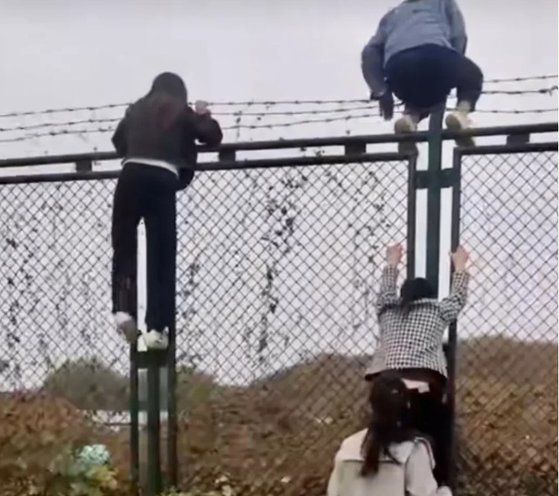 중국 허난성 정저우시 폭스콘 노동자들로 추정되는 이들이 공장 철조망을 넘는 모습. 사진 중국 진르터우탸오 캡처