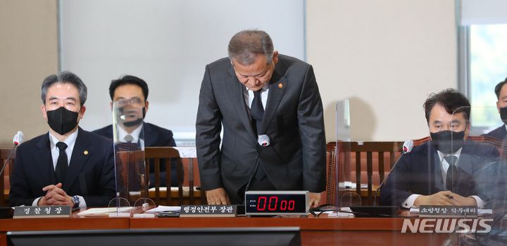 [서울=뉴시스] 최진석 기자 = 이상민 행정안전부 장관이 1일 서울 여의도 국회에서 열린 행정안전위원회 전체회의에서 이태원 참사 현안 관련 보고를 하기에 앞서 인사하고 있다. 2022.11.01. myjs@newsis.com |