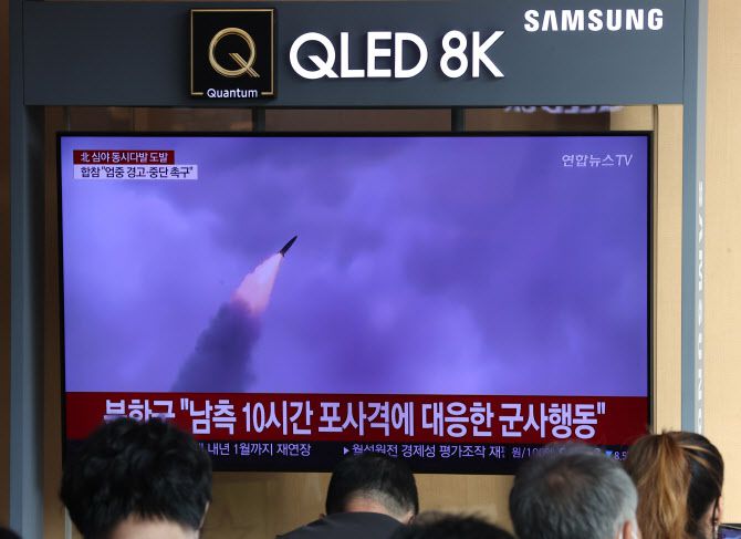 북한이 군용기 10여 대를 동원해 서·동부 비행금지구역 인근까지 접근해 위협 비행한 데 이어 동해상으로 탄도미사일을 발사한 지난 14일 오후 서울역 대합실에 관련 보도가 나오고 있다. 사진=연합뉴스 |