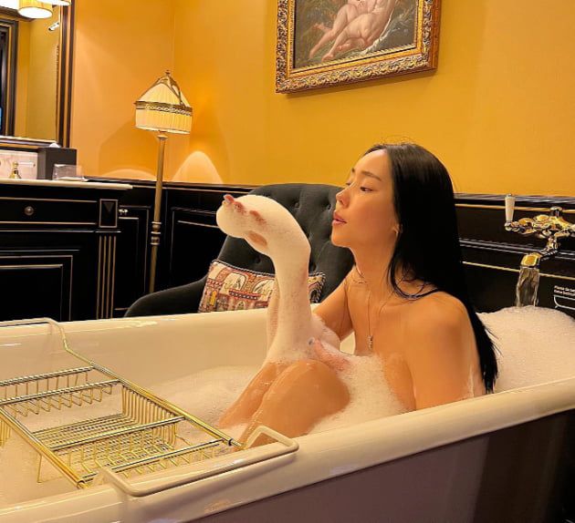 공개된 사진 속 꽃자는 욕조에 앉아 거품 목욕을 하는 모습. 탄탄한 몸매와 화려한 이모구비가 보는 이들의 시선을 끌었다.