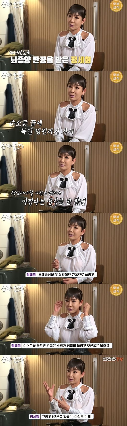 특히 정세희는 "2005년도에 뇌종양이 발병했다. 골프공 크기만한 사이즈로 자리잡고 있었다. 한국에서 유명한 대학병원에서도 수술을 못한다고 손을 드셨다. 그러다가 수소문 끝에 독일 대학병원에 가서 20시간동안 종양 제거 수술을 받았다"고 밝혀 충격을 안겼다.