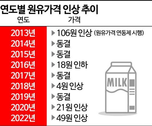 이번 원유 가격 인상은 2013년 원유가격 연동제가 시행되면서 106원이 한꺼번에 오른 이후 가장 큰 폭으로 이뤄졌다. 2014년과 2015년에는 원유 가격이 동결됐고 2016년은 18원 인하됐다. 이후 2017년 동결을 거쳐 2018년 4원 인상된 원유 가격은 2019년 또 동결된 뒤 2020년엔 21원 인상됐다. 당시는 코로나19 상황을 고려해 가격 적용이 1년 유예되면서 실제론 지난해 8월 이 가격이 적용됐다.