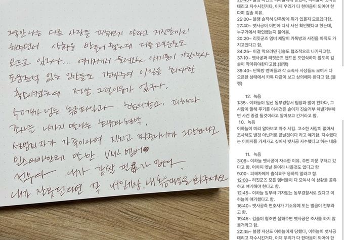그러면서 “혹시 제가 잘못된다면 제 휴대전화에 있는 녹음 파일, 일기장, 사진 앨범에 뱃사공 폴더 캡처본을 꼭 확인해달라”며 “그때는 그 누구도 보호하지 않고 나에게 회유하고 사과하지 않았던 그 모두를 다 밝히고 떠날 것”이라고도 경고했다.