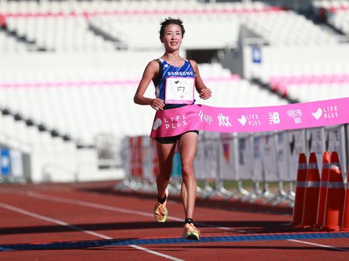 (서울=연합뉴스) 김도연이 6일 열린 2022 JTBC 서울마라톤에서 여자 선수 중 가장 먼저 서울시 송파구 종합운동장 피니시라인을 통과하고 있다. [대한육상연맹 제공. 재판매 및 DB금지]