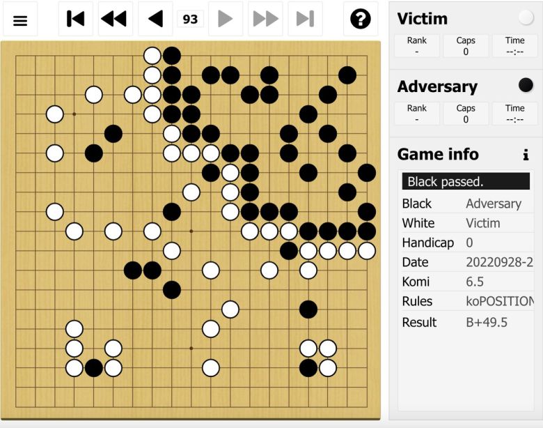 카타고(Victim)와 약점 공격 프로그램(Adversary)의 대국. 카타고가 백돌. (사진=논문 "Adversarial Policies Beat Professional-Level Go AIs") |