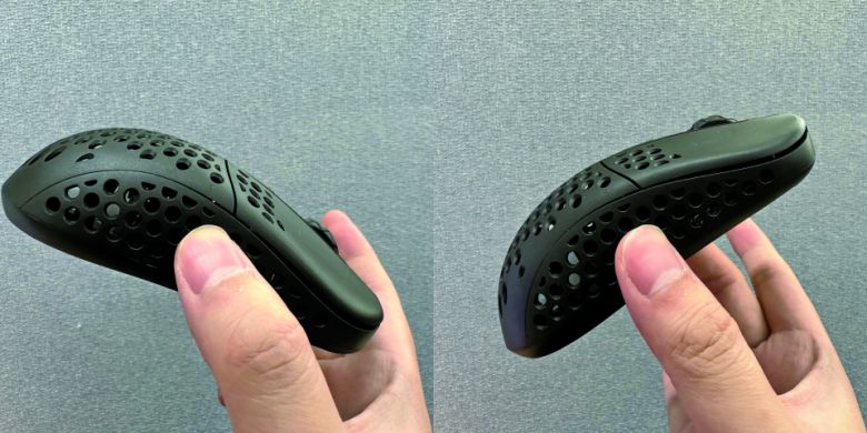 Xtrfy M4 Wireless 마우스. 비대칭 형태라는 것 외에 다른 스위치, 센서 등은 M42 Wireless와 동일하며 71g로 무게 차이가 미세하게 있다. |