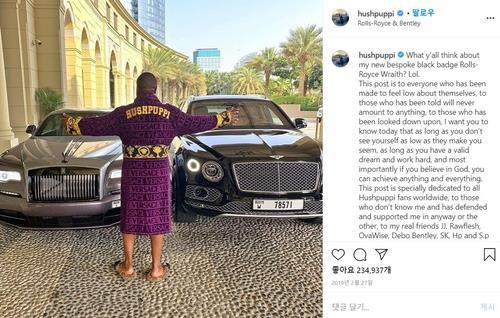 돈뭉치를 흩뿌리는 영상을 게시하는가 하면, 전용기에서 명품 패션을 뽐내는 사진을 올렸다. 벤틀리, 페라리, 벤츠, 롤스로이스 차량이 줄지어 선 가운데 포즈를 취하는 사진을 '#올마인(AllMine)'이라는 해시태그를 달아 올리기도 했다.