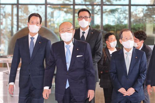 현암 김종희 한화그룹 창업주의 탄생 100주년 기념 행사가 10일 63빌딩에서 열렸다. 왼쪽부터 김승연 한화그룹 회장의 차남인 김동원 한화생명 부사장, 김승연 회장, 삼남인 김동선 한화호텔앤드리조트 전무, 금춘수 한화 부회장이 행사에 참석하고 있다.  <이충우 기자>