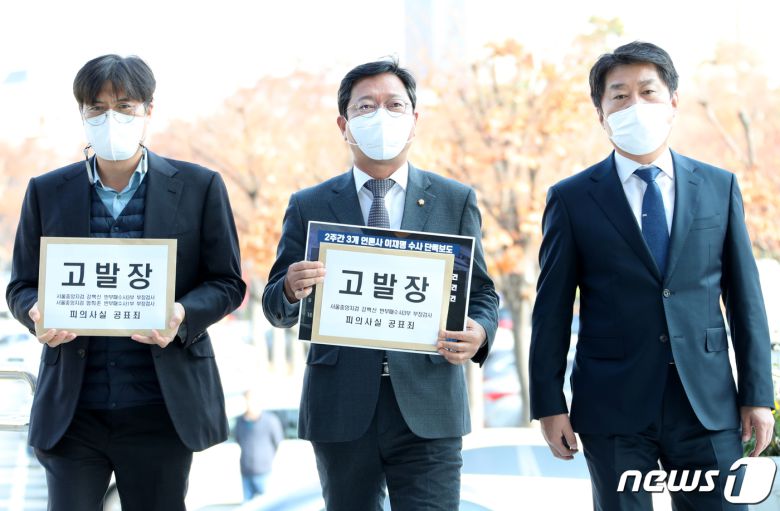 (서울=뉴스1) 권현진 기자 = 더불어민주당 김현국 법률위원장 국장(왼쪽부터)과 김승원 법률위원장, 황명선 민주당 대변인이 11일 과천종합청사 공수처에 고발장을 제출하기 위해 종합민원실로 들어서고 있다. 더불어민주당은 이재명 민주당 대표의 측근인 김용 민주연구원 부원장과 정진상 대표실 정무조정실장 등을 수사 중인 서울중앙지검 반부패수사3부 강백신 부장검사와 엄희준 반부패수사제1부 부장검사를 피의사실 공표 혐의로 고위공직자범죄수사처(공수처)에 고발한다고 밝혔다. 2022.11.11/뉴스1