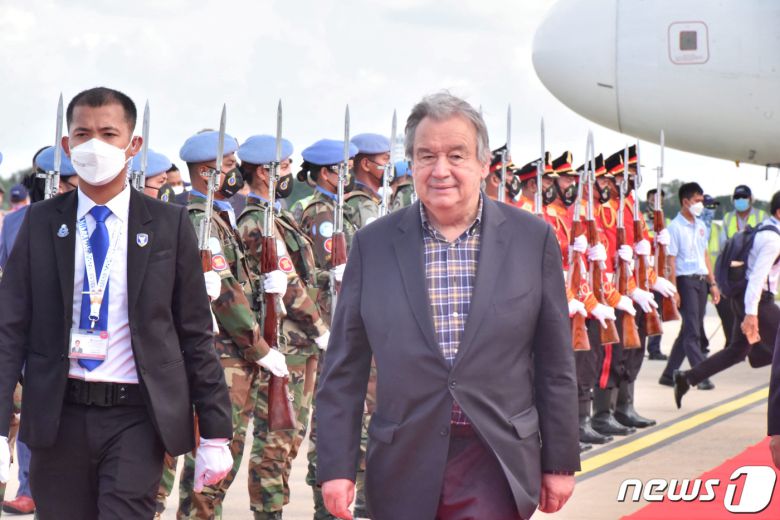 안토니우 구테흐스 유엔 사무총장이 11일(현지시간) 캄보디아 프놈펜에서 열린 아세안 정상회의에 참석하기 위해 도착한 모습. 2022.11.11/뉴스1 ⓒ 로이터=뉴스1 ⓒ News1 김민수 기자 |