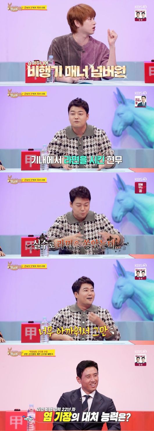 MC들도 비행기 탑승 관련 에피소드를 언급하기도 했다. 김희철은 “슈퍼주니어는 비행기 매너가 세계적으로 넘버원이다”라며 90도로 인사를 하던 경험담을 털어놨다. 김형래 부문장도 “승무원들 사이에서 슈퍼주니어가 타면 너무 매너가 좋다고 하더라”라고 말했다.