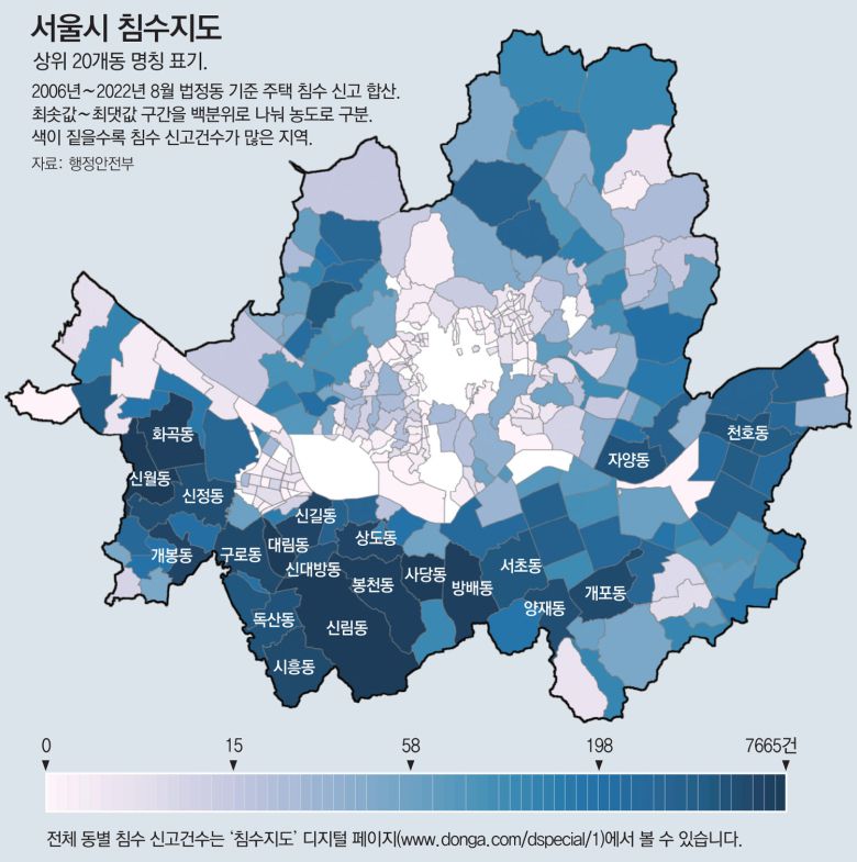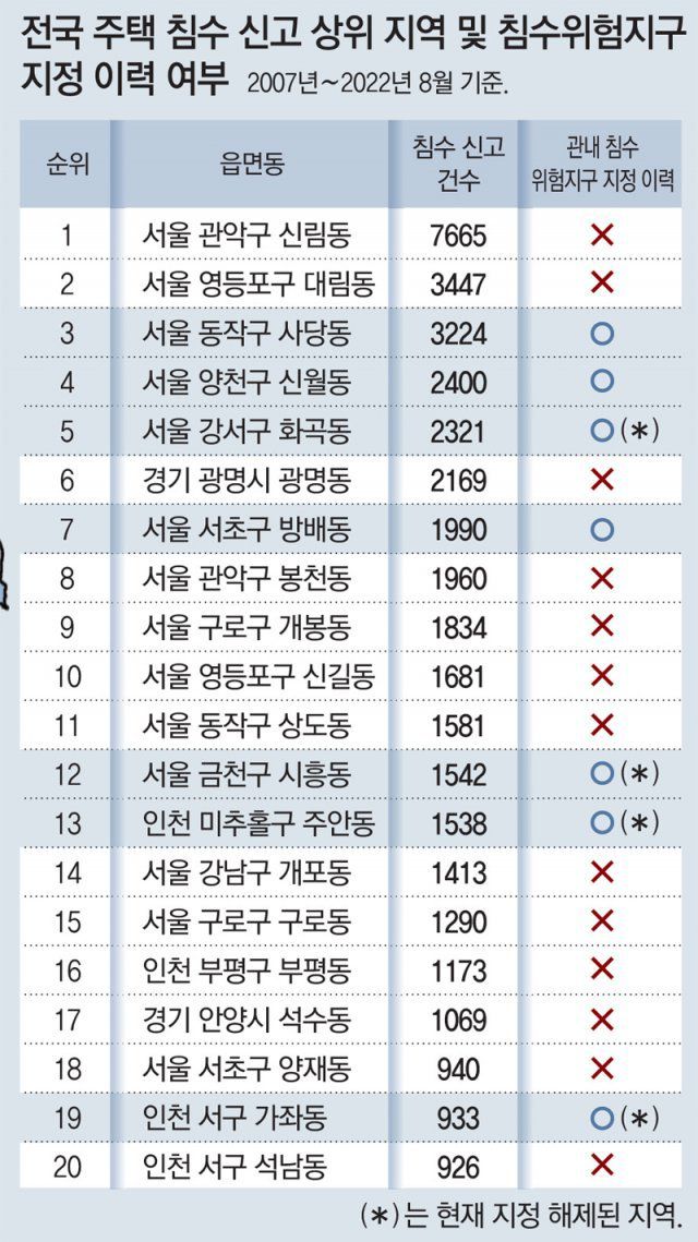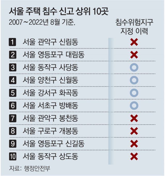 동아일보는 행정안전부로부터 2007년∼2022년 8월 전국 읍면동 주택 침수 신고 건수 자료를 입수해 분석했다. 그 결과 상습 침수 지역으로 많이 알려진 서울 관악구 신림동(1위·7665건), 양천구 신월동(4위·2400건) 등 외에도 사각지대에 있던 침수 지역들이 다수 드러났다.
