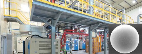 소화약제가 함유된 마이크로캡슐을 생산하고 있는 지에프아이 설비 모습. 작은 사진은 소화약제를 함유한 미세캡슐을 확대한 모습. 실제 크기는 지름 0.1㎜ 다. 【사진 제공=지에프아이】 |