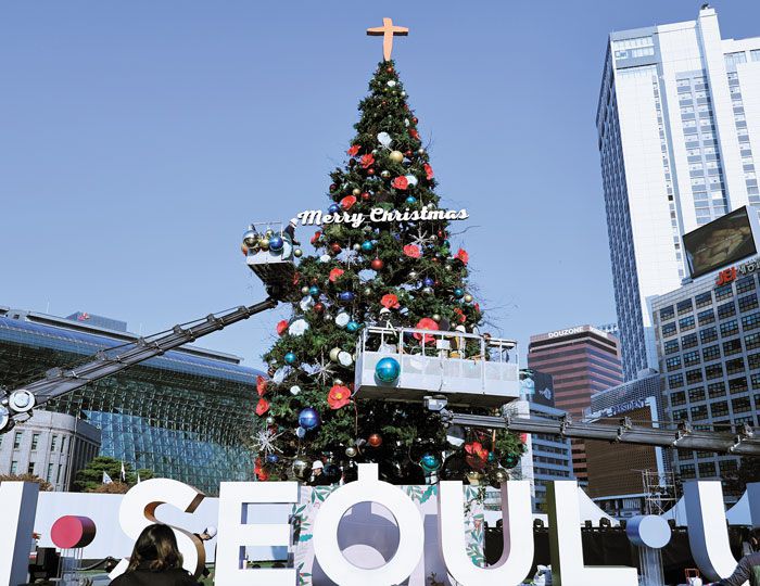 크리스마스를 한 달여 앞둔 18일 오후 서울시청 앞 서울광장에 대형 크리스마스 트리가 설치되고 있다. 19일 오후 5시 트리 점등식을 시작으로 내년 1월 1일까지 불을 밝힌다. 성탄절을 축하하고 코로나19로 지친 시민들을 위로하기 위해 마련됐다.