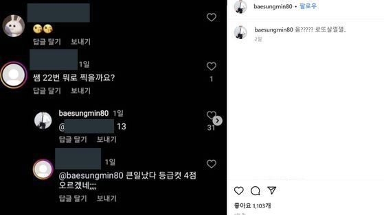 이에 배 강사는 지난 18일 제자와 나눈 대화를 캡처해 올린 뒤 "음???? 로또 살 걸"이라며 믿기지 않는다는 반응을 보였다.