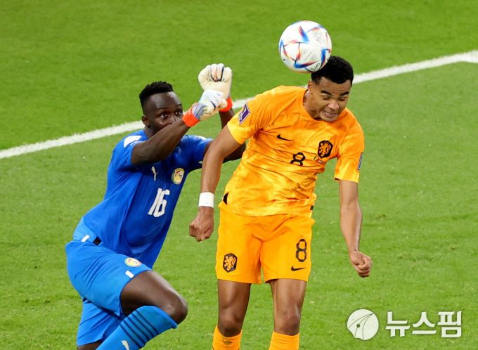 [카타르 로이터=뉴스핌] 이태성 기자 = 22일(한국시간) 카타르 알투마마 스타디움에서 열린 세네갈과 네덜란드의 A조 두번째 경기에서 네덜란드 코디 각포(MF, PSV 아인트호벤)가 헤딩으로 선취점을 만들어내는 장면이다. 이날 경기는 네덜란드가 2대0으로 승리했다. 2022.11.22 victory@newspim.com |