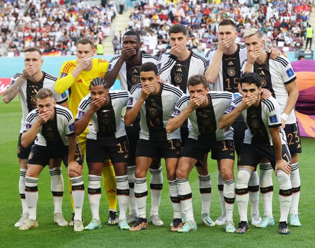 독일 대표팀 선수들은 23일(한국시간) 카타르 알라얀의 칼리파 인터내셔널 스타디움에서 열린 일본과의 월드컵 조별리그 E조 1차전을 앞두고 그라운드에서 출전 선수들의 단체 사진 촬영 때 일제히 오른손으로 입을 가리는 동작을 했다.