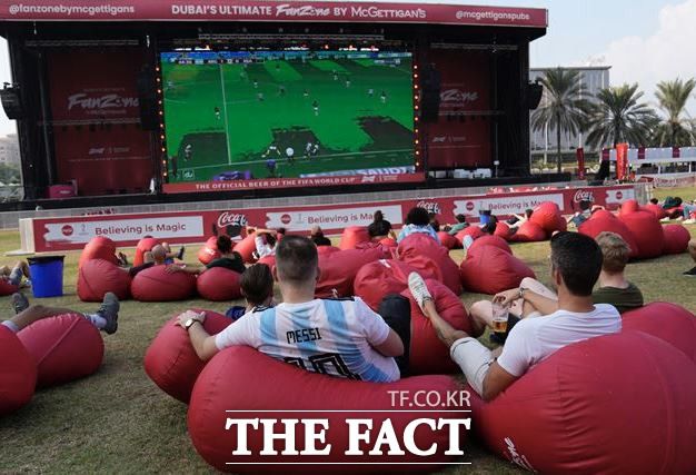 아랍에미리트(UAE) 두바이에 설치된 '팬 존'의 대형 스크린으로 22일 아르헨티나-사우디아라비아 월드컵 1차전 경기를 보는 축구 팬들. /두바이=AP.뉴시스 |