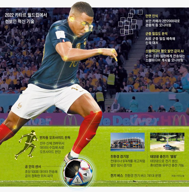 2022 카타르 월드컵은 경기장 바깥 대회 운영에도 혁신적인 AI 기술이 적용됐다. 안면 인식 기술로 경기장 내 보안을 유지하고 군중 밀집 정도를 분석해 불의의 사고를 미리 대처한다. 컨테이너를 레고처럼 쌓은 임시 경기장 건물과 경기장 주변에 설치된 태양광 충전기는 친환경 기술로 주목받고 있다. 미국 워싱턴포스트는 “2022 카타르 월드컵은 스타디움 온도 조절부터 축구공에 이르기까지 모든 게 센서와 알고리즘으로 연결되고 운영된다”며 “각종 혁신적인 AI 신기술이 집약된 대회”라고 했다.