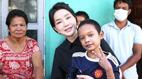윤석열 대통령 부인 김건희 여사가 지난 12일(현지시간) 캄보디아 프놈펜에서 선천성 심장질환을 앓고 있는 14세 아동의 집을 찾아 아이를 안고 있다. 사진 대통령실 |