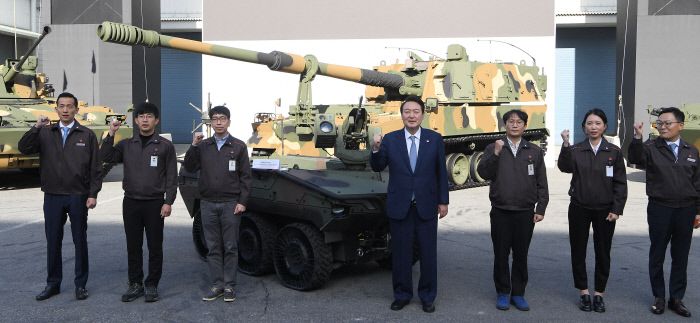 윤석열 대통령이 24일 경남 창원시 소재 방산업체인 한화에어로스페이스를 방문해 K9 자주포 앞에서 업체 임직원들과 기념촬영을 하고 있다. 대통령실사진기자단