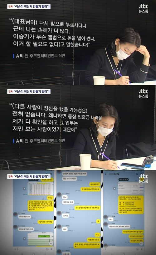 지난 25일 방송된 JBC '뉴스룸'에서는 가수 겸 배우 이승기의 소속사 후크엔터테인먼트 전 직원 A 씨와의 인터뷰가 전파를 탔다.