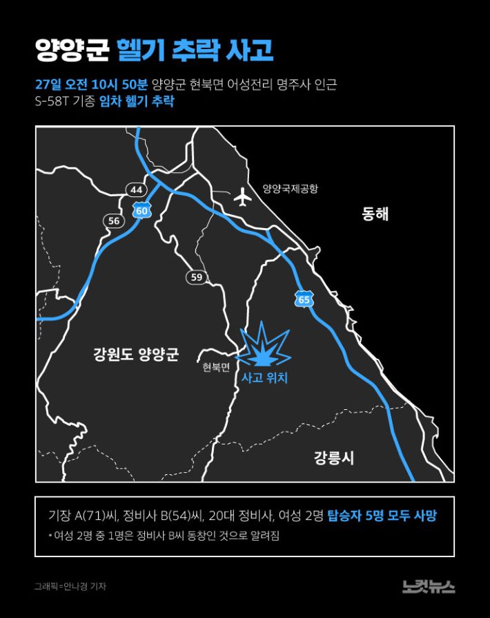 앞서 지난 27일 오전 10시 50분쯤 양양군 현북면 어성전리 명주사 인근에 S-58T 기종 중형 임차 헬기가 추락했다. 사고 현장에서는 헬기에 타고 있던 기장 A씨와 정비사 B(54)씨 등 5구의 시신이 발견됐다. 소방당국은 당초 사고 현장에서 배터리 등에서 기체의 추가 폭발이 우려돼 탑승자들에 대한 접근이 어려웠지만, 화재를 진압한 이후 잿더미 속에서 모두 5구의 시신을 수습했다.