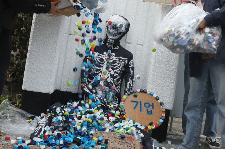 회견을 마친 이들은 몸 속에 재활용 되지 않은 플라스틱이 가득한 해골이 이중병뚜껑 무덤 위에 쓰러지는 행위극도 진행했다.