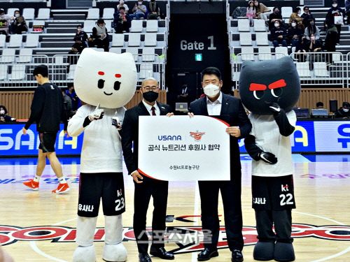 [스포츠서울 | 김수지기자] 프로농구 수원 KT소닉붐이 지난 26일 KT소닉붐아레나에서 벌어진 창원 LG 세이커스와의 홈경기에서 유사나헬스사이언스(이하 유사나)와 뉴트리션 후원 계약을 기념하는 ‘유사나 프로농구 브랜드데이’ 이벤트를 진행했다.