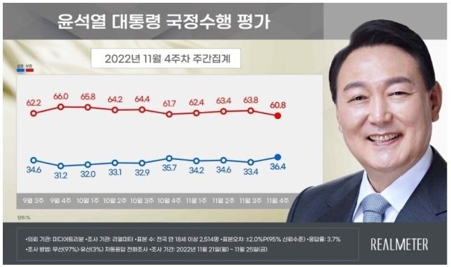 28일 리얼미터가 미디어트리뷴 의뢰로 이달 21일부터 25일까지 전국 만 18세 이상 유권자 2514명을 대상으로 조사한 결과, 윤 대통령의 국정 수행에 대한 긍정 평가는 36.4%, 부정 평가는 60.8%로 나타났다.