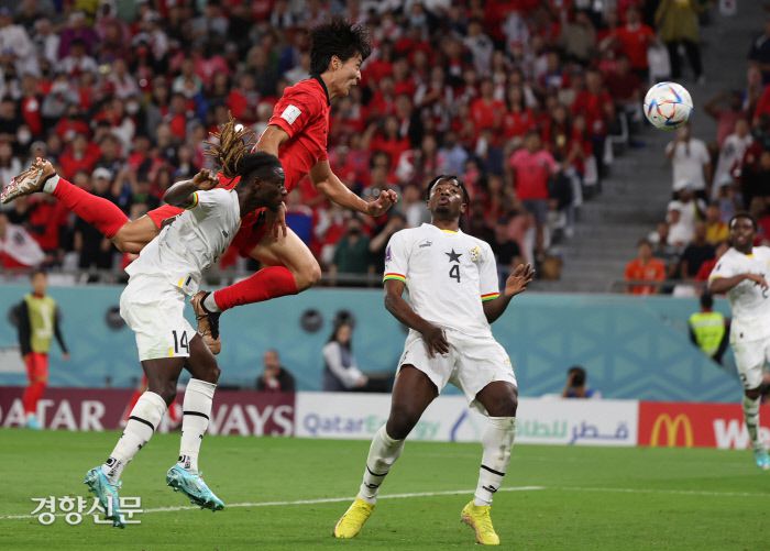 그림 같은 헤딩골 카타르 알라이얀의 에듀케이션 시티 스타디움에서 28일 열린 2022 카타르 월드컵 조별리그 H조 2차전 대한민국과 가나의 경기에서 조규성이 동점골을 성공시키고 있다 알라이얀 | 권도현 기자 lightroad@kyunghyang.com