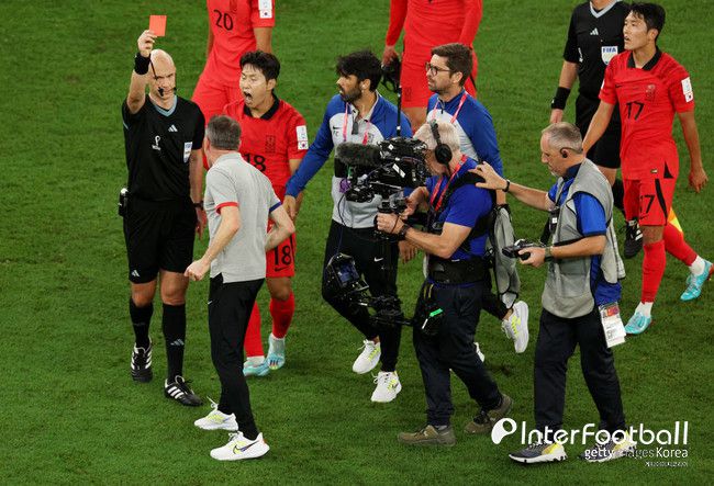 한국은 포기하지 않고 몰아쳤지만 결국 시간이 부족했다. 하지만 경기 종료 타이밍이 이상했다. 추가시간의 추가시간이 필요한 상황이었지만 앤서니 테일러 주심은 마지막 코너킥을 주지 않고 경기를 끝내버렸따. 벤투 감독은 곧바로 벤치에서 튀어나와 테일러 주심에게 가 격렬하게 항의했다. 벤투 감독은 1차전 이미 경고가 있어서 카드를 조심해야 하는 상황이었지만 강하게 항의하다가 결국 퇴장을 명령받았다. 벤투 감독은 규정에 따라 3차전 포르투갈전에서 벤치에도 앉을 수 없다.
