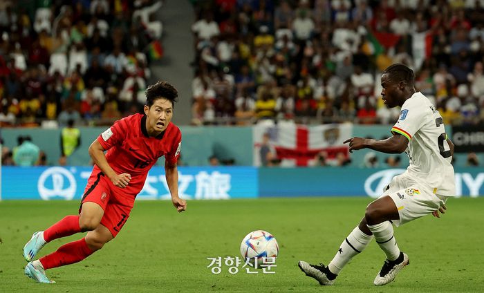 한국 축구대표팀 이강인(왼쪽)이 28일(현지시간) 카타르 알 라이얀의 에듀케이션 시티 스타디움에서 열린 가나와의 2022 국제축구연맹(FIFA) 카타르 월드컵 조별리그 H조 2차전에서 드리블하고 있다.      알 라이얀 | 연합뉴스