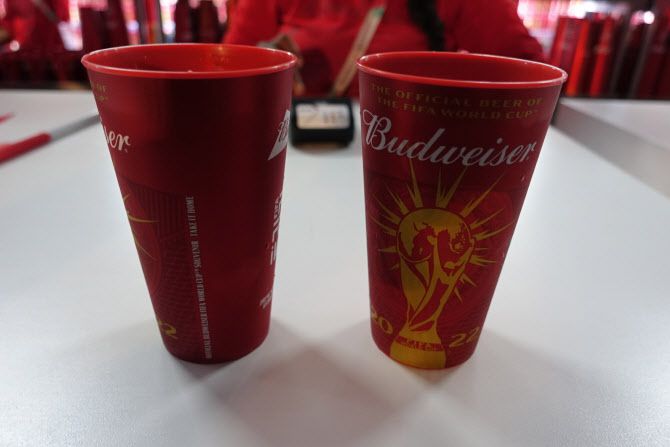 카타르월드컵 팬페스트에서 판매하는 맥주 두 잔. 한 잔 가격은 거의 2만원에 이른다. 사진=이석무 기자