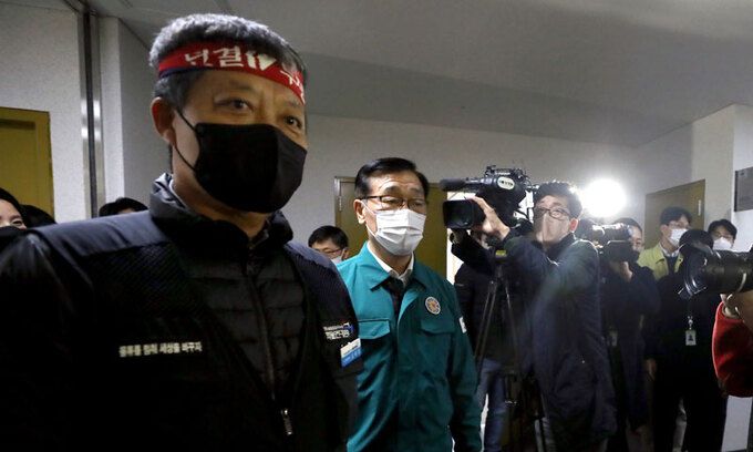 민주노총 공공운수노조 화물연대(화물연대)의 집단운송거부 파업 닷새째인 28일 오후 세종시 정부세종청사 국토교통부에서 열린 정부와 화물연대의 1차 협상을 위해 화물연대 노조원들과 어명소 국토부 2차관이 회의장으로 입장하고 있다. 뉴스1