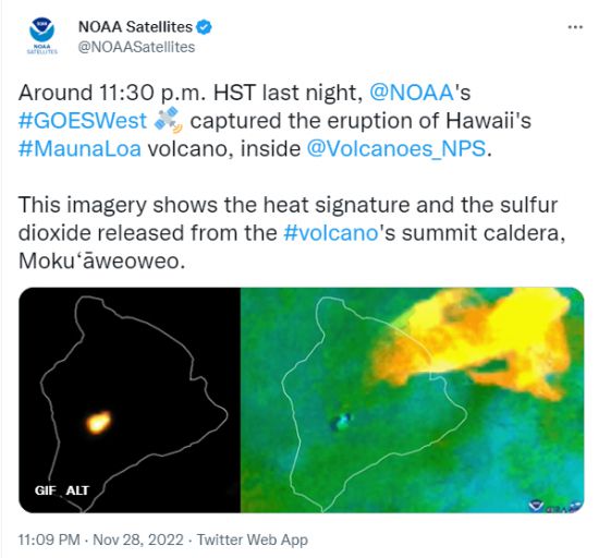 미국 국립해양대기국(NOAA)이 인공위성을 통해 하와이 소재 세계 최대의 활화산인 '마우나 로아'의 폭발 장면을 촬영해 트위터에 공개했다. 이 화산은 지난 27일 오후 11시30분(현지시간) 38년 만의 휴지기를 깨고 용암과 대규모 화산재, 연기를 내뿜으면서 분화를 시작했다. NOAA가 운영하는 정지궤도 위성 GOES 웨스트는 마우나 로아의 분화구에서 분출한 용암에서 나오는 열 신호와 이산화황 가스의 대규모 발산 장면을 포착했다.