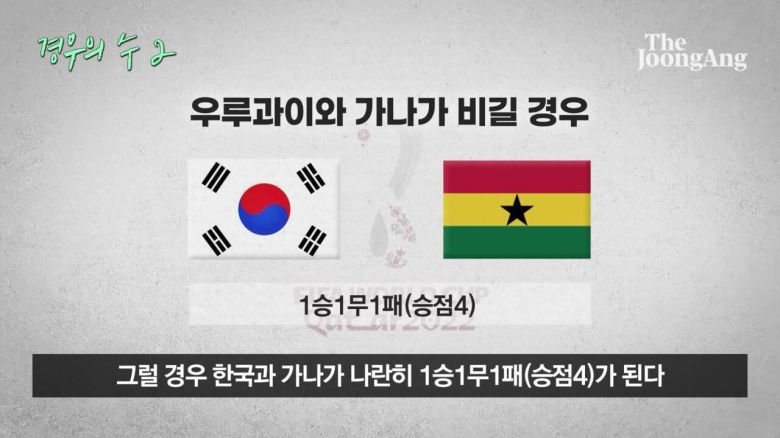 한국이 포르투갈을 꺾고 우루과이가 가나를 1골 차로 이기면 한국이 16강에 오를 수 있다. 한국과 우루과이가 1승1무1패(승점 4)로 동률이 되지만 골 득실차에서 한국이 우세하기 때문이다.